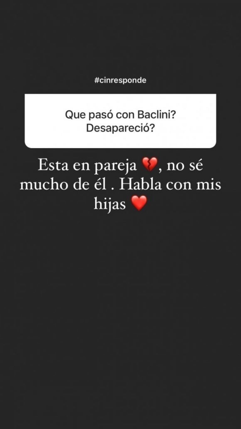 Pero eso no fue todo. Otro follower de la panelista insistió en búsqueda de más claridad sobre Martín y le indagó: “¿Qué pasó con Baclini? ¿Desapareció?”. Así, Cinthia pegó otro grito en el cielo y exclamó: "Está en pareja. No sé mucho de él. Habla con mis hijas".