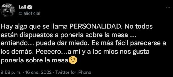 A través de su cuenta de Twitter, Lali respondió sin filtro y fiel a su estilo: “Hay algo que se llama PERSONALIDAD. No todos están dispuestos a ponerla sobre la mesa... entiendo... puede dar miedo. Es más fácil parecerse a los demás. Peeeero.. .a mí y a los míos nos gusta ponerla sobre la mesa”.
