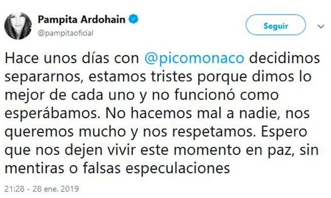 El poco amor que había entre ambos traspasaba cualquier lente de la cámara y los canjes comenzaron a caerse. Finalmente, así como se terminó el dinero se terminó el amor, que fue anunciado con un polémico twit de la modelo: “Hace unos días con @picomonaco decidimos separarnos, estamos tristes porque dimos lo mejor de cada uno y no funcionó como esperábamos”.