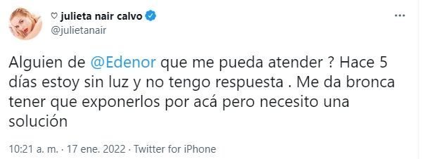 "¿Alguien de @Edenor que me pueda atender? Hace cinco días que estoy sin luz y no tengo respuesta. Me da bronca tener que exponerlos por acá, pero necesito una solución", expresó.