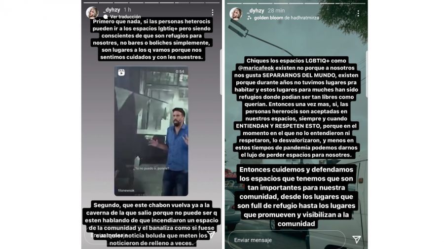 En un tono contundente, Dyhzy remarcó: “Chiques los espacios LGBTIQ+ como @maricafeok existen no porque a nosotros nos gusta SEPARARNOS DEL MUNDO, existen porque durante años no tuvimos lugares para habitar y estos lugares para muches han sido refugios donde podían ser tan libres como querían. Entonces una vez más, si, las personas hererocis son aceptadas en nuestros espacios, siempre y cuando ENTIENDAN Y RESPETEN ESTO, porque en el momento en el que no lo entendieron ni respetaron, lo desvalorizaron, y menos en estos tiempos de pandemia podemos darnos el lujo de perder espacios para nosotres. Entonces cuidemos y defendamos los espacios que tenemos que son tan importantes para nuestra comunidad, desde los lugares que son full de refugio hasta los lugares que promueven y visibilizan a la comunidad”.