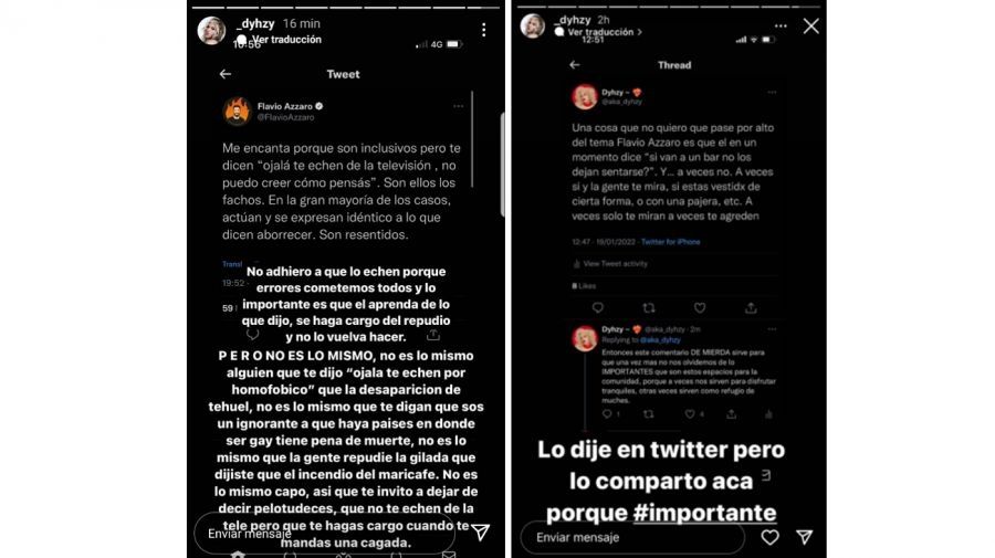 Además, a través de su cuenta de Twitter, Dyhzy aclaró: “Una cosa que no quiero que pase por alto del tema Flavio Azzaro es que el en un momento dice ‘si van a un bar no los dejan sentarse?’. Y… a veces no. A veces sí y la gente te mira, si estas vestidx de cierta forma, o con una pajera, etc. A veces solo te miran a veces te agreden. Entonces este comentario DE MIERD* sirve para que una vez mas no nos olvidemos de lo IMPORTANTES que son estos espacios para la comunidad, porque a veces nos sirven para disfrutar tranquiles, otras veces sirven como refugio de muches”.