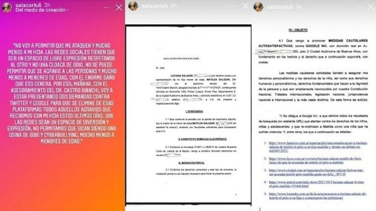 Además, Salazar adjunto las denuncias judiciales que inició. "Por eso, mañana (por hoy), con el asesoramiento del Dr. Castro Bianchi, voy a estar presentando dos demandas contra Twitter y Google para que se elimine de esas plataformas todos aquellos agravios que recibimos con mi hija estos últimos días. Que las redes sean un espacio de diversión y expresión, no permitamos que sigan siendo una usina de odio y cyberbullyng, muchos menos a menores de edad".