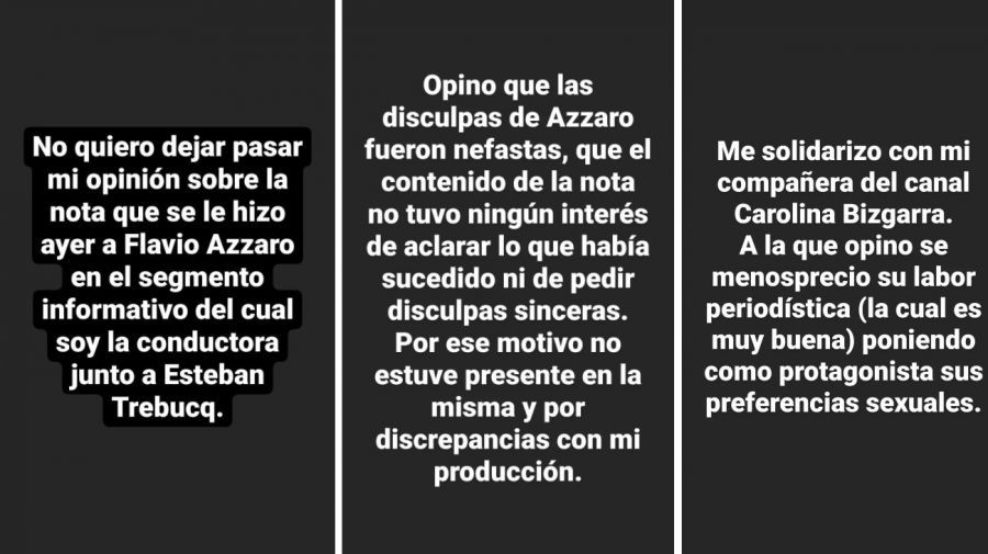 Luego, Diarco continuó: “Opino que las disculpas de Azzaro fueron nefastas, que el contenido de la nota no tuvo ningún interés de aclarar lo que había sucedido ni de pedir disculpas sinceras. Por ese motivo no estuve presente en la misma y por discrepancia con mi producción. Me solidarizó con mi compañera del canal Carolina Bizgarra. A la que opino, se menospreció su labor periodística (la cual es muy buena) poniendo como protagonista sus preferencias sexuales. Me solidarizo con todo el colectivo LGBTQ+ el cual siento que fue insultado de manera aberrante por Flavio Azzaro”.