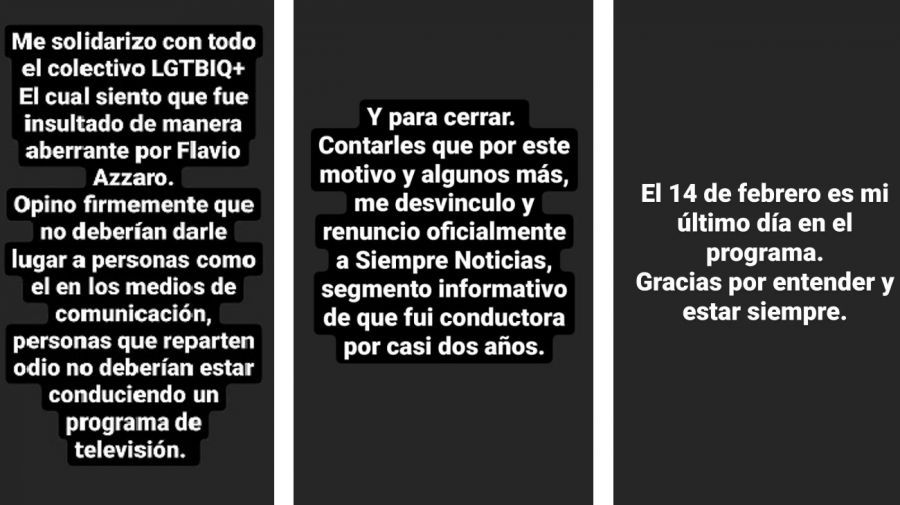 Además, la integrante de Crónica TV siguió contra Flavio Azzaro y su rol en la televisión. "Opinó firmemente que no deberían darle lugar a personas cómo él en los medios de comunicación, personas que reparten odio no deberían estar conduciendo un programa de televisión. Y para cerrar. Contarles que por este motivo y algunos más, me desvinculo y renunció oficialmente a Siempre Noticias, segmento informativo del que fui conductora por casi dos años. El 14 de febrero es mi último día en el programa. Gracias por entender y estar siempre”.