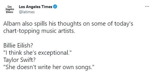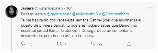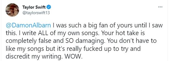 "Damon Albarn, era tan fan tuyo hasta que vi esto. Escribo todas mis propias canciones. Tu opinión es completamente falsa y tan dañina. No es necesario que te gusten mis canciones, pero es realmente jodido tratar de desacreditar mis escritos", expresó la artista pop desde su cuenta de redes sociales.
