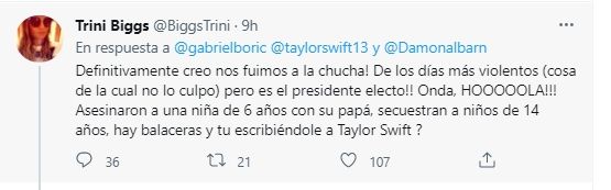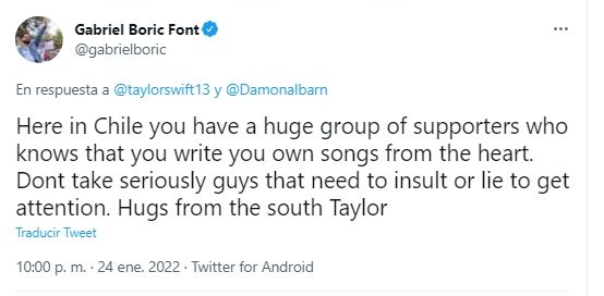 "Aquí en Chile tienes un gran grupo de seguidores que saben que escribes tus propias canciones desde el corazón. No tomes en serio a los chicos que necesitan insultar o mentir para llamar la atención. Abrazos desde el sur, Taylor", afirmó el presidente Boric.