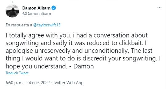Minutos más tarde, el propio Albarn se refirió a la polémica aclarando que sus declaraciones fueron tergiversadas: "Tuve una conversación sobre composición de canciones y, lamentablemente, se redujo a clickbait. Me disculpo sin reservas y sin condiciones. Lo último que querría hacer es desacreditar tu composición. Espero que entiendas".