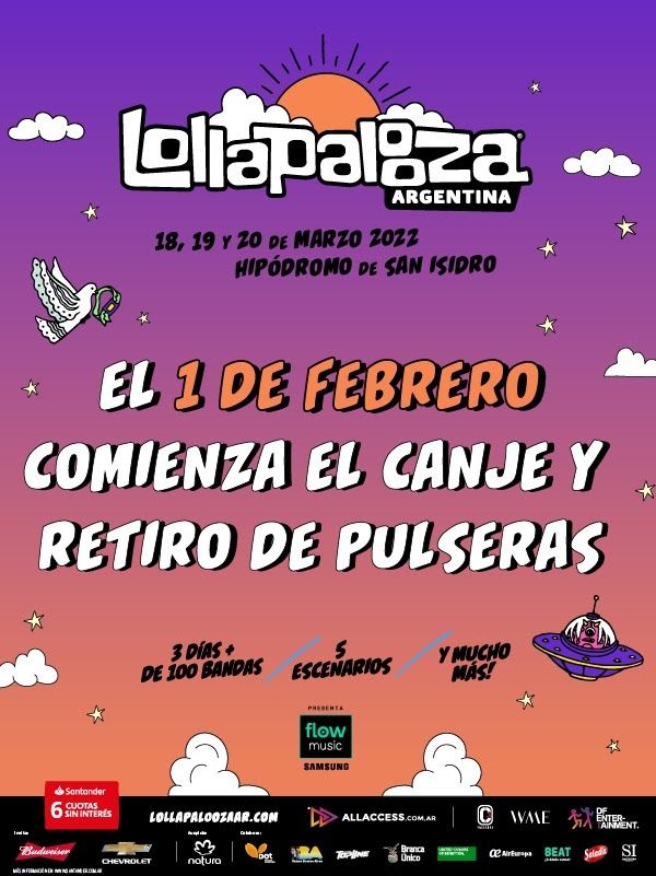 Lollapalooza Argentina confirmó el comienzo del canje y envío de pulseras para la séptima edición del festival a realizarse los días viernes 18, sábado 19 y domingo 20 de marzo en el Hipódromo de San Isidro.