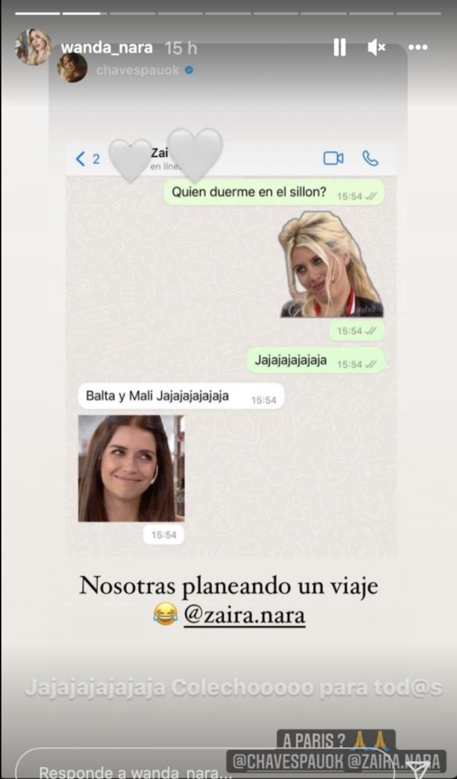 Pero como era de esperarse, alguien más quiso opacar un poquito la confirmación del nuevo romance de María Eugenia y fue Wanda Nara, quien aprovechó la oportunidad para compartir un chat con su hermana Zaira en el cual planean un viaje a París junto a Paula Chaves, ex amiga de la China, que se alejó de ella tras el escándalo. ¿Casualidad?
