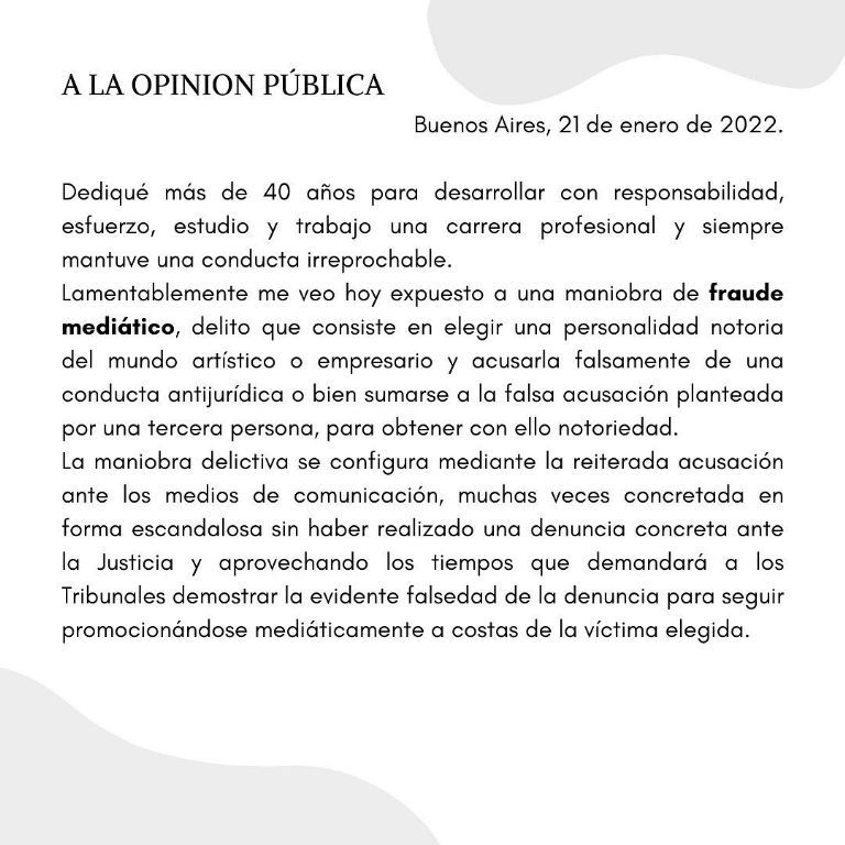 "Dediqué más de 40 años para desarrollar con responsabilidad, esfuerzo, estudio y trabajo una carrera profesional y siempre mantuve una conducta impecable. Lamentablemente me veo hoy expuesto a una maniobra de fraude mediático, delito que consiste en elegir una personalidad notoria del mundo artístico o empresario y acusarlo falsamente de una conducta antijurídica o bien sumarse a la falsa acusación planteada por una tercera persona, para obtener con ella notoriedad", expresó el actor.