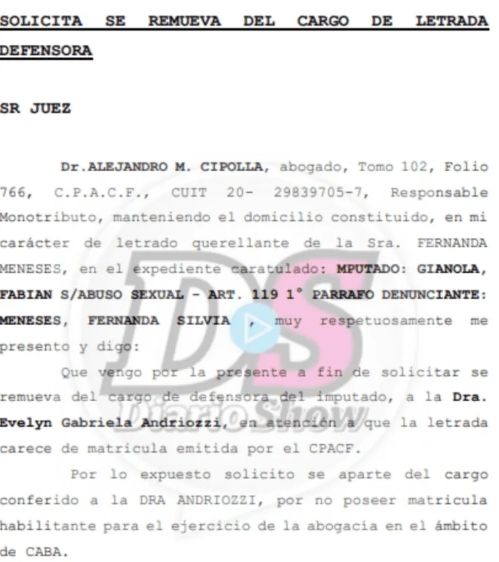 Sin embargo, según publicó el sitio Diario Show, Alejandro Cipolla, el letrado querellante de Meneses, solicitó que "se remueva del cargo de defensora del imputado a la Dra. Evelyn Gabriela Andriozzi" porque "carece de matrícula emitida por el CPACF (Colegio Público de Abogados de Capital Federal)".