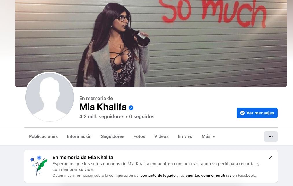 Los rumores sobre la muerte de Mia Khalifa acapararon las redes sociales y los principales medios de comunicación. La noticia se volvió viral luego que su página oficial de Facebook fue actualizada a "In memoriam". Este cambio que realiza la plataforma convierte las páginas de sus usuarios anunciando la muerte de ellos, invitando a despedirla con algún mensaje.