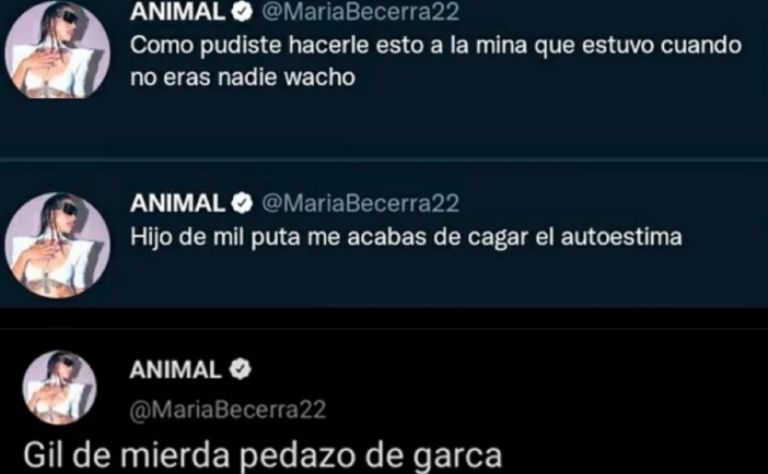 La polémica se trasladó rápidamente a las redes, donde ambos artistas cruzaron duros mensajes. "Hijo de re mil put*, me acabas de cag* la autoestima", "Cómo pudiste hacerle esto a la mina que estuvo cuando no eras nadie wacho" y "Gil de mierd*, pedazo de garca", fueron algunos de los mensajes que le dedicó Becerra a Rusher desde su cuenta de Twitter.