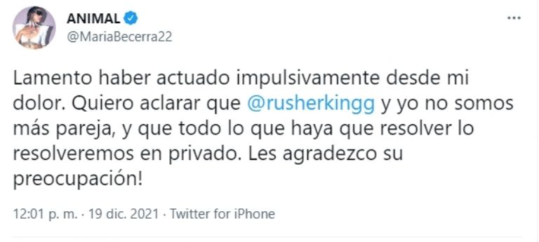 Con el correr de los días el enfrentamiento fue bajando su nivel. A tal punto que Becerra pidió disculpas públicamente por su exabrupto tuitero. "Lamento haber actuado impulsivamente desde mi dolor. Quiero aclarar que @rusherkingg y yo no somos más pareja, y que todo lo que haya que resolver lo resolveremos en privado. Les agradezco su preocupación!", escribió.
