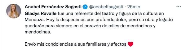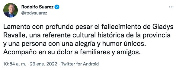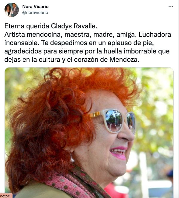 "Lamento con profundo pesar el fallecimiento de Gladys Ravalle, una referente cultural histórica de la provincia y una persona con una alegría y humor únicos. Acompaño en su dolor a familiares y amigos", expresó en su cuenta de Twitter el Gobernador de Mendoza Rodolfo Suarez.