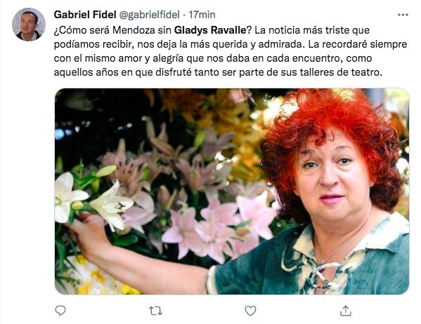 Por su parte, Gabriel Fidel, referente histórico del radicalismo provincial, compartió: "¿Cómo será Mendoza sin Gladys Ravalle? La noticia más triste que podíamos recibir, nos deja la más querida y admirada. La recordaré siempre con el mismo amor y alegría que nos daba en cada encuentro, como aquellos años en que disfruté tanto ser parte de sus talleres de teatro".