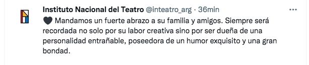 "Mandamos un fuerte abrazo a su familia y amigos. Siempre será recordada no solo por su labor creativa sino por ser dueña de una personalidad entrañable, poseedora de un humor exquisito y una gran bondad. Así la recordamos desde el INT", expresaron desde el Instituto Nacional del Teatro.