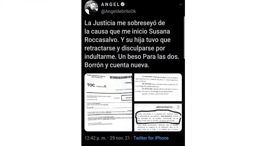 Esa gestión por calumnias e injurias pareciera que llegó a su final, al menos por lo que informó Ángel, que en sus redes sociales exhibió la resolución de la justicia, con el sobreseimiento. Aunque, Susana replicó que no era definitivo y que de Brito se había equivocado.