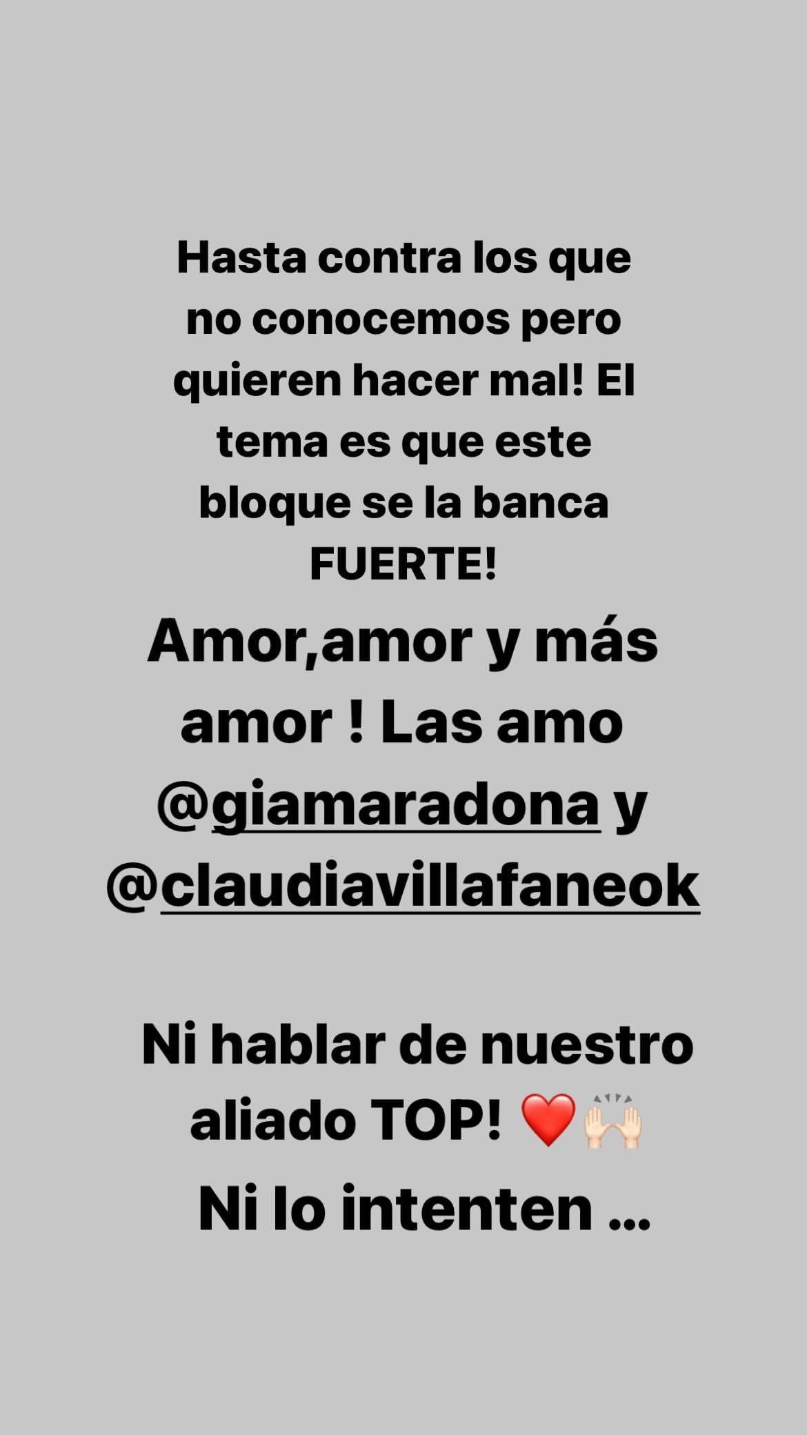 A través de su cuenta de Instagram, Dalma Maradona publicó una historia cuyo texto indica: “Hasta contra los que no conocemos, pero quieren hacer mal. El tema es que este bloque se la banca FUERTE. Amor, amor, y más amor. Las amo Gianinna Maradona y Claudia Villafañe. Ni hablar de nuestro aliado TOP. Ni lo intenten...”, escribió la actriz junto a dos emojis, uno de un corazón rojo y otro de unas manos levantadas.