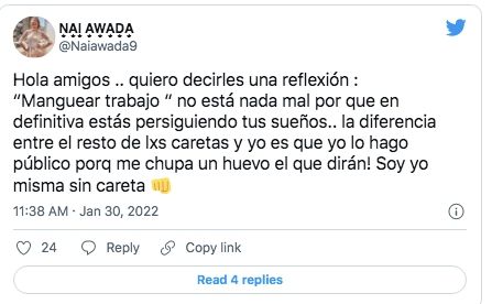 Lejos de obviar ese tipo de comentario dañino, Nai decidió confrontar con su verdad y armó un tuit muy sincero para clarificar su pensamiento ante las recriminaciones. Este domingo, la influencer publicó: "Hola amigos. Quiero decirles una reflexión: ‘Manguear trabajo’ no está nada mal porque en definitiva estás persiguiendo tus sueños".