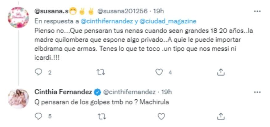 Y después de descargarse, una usuaria de Twitter le saltó a la yugular con lo peor que le podía cuestionar: su rol como mamá. “Pienso, ¿no?... ¿Qué pensarán tus nenas cuando sean grandes? 18, 20 años. La madre quilombera que expone algo privado”, se mandó la mujer.