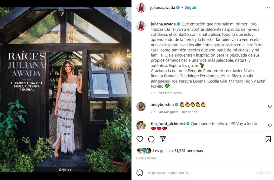 “Raíces es un camino posible, el que yo he seguido, para alcanzar el bienestar general. Como a todos, a menudo mi cuerpo me ha reclamado modificar algunos hábitos y no subestimar sus señales. Sin imponer un estilo mandatorio o excluyente de otras opciones, aquí comparto lo que a mí me sirve cada día con la esperanza de que también pueda ayudar o inspirar a otros”, escribió Awada sobre su flamante libre.