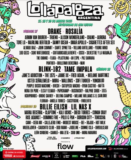 Como ya nos tiene acostumbrado, el Lolla traerá al país a figuras de la música tanto nacionales como internacionales. En esta edición, tendrá como protagonistas a Billie Eilish, Drake, Lil Nas X, Tame Impala y Blink-182, entre otras más de 100 bandas y solistas. Se espera que asistan más de 100 mil personas por fecha.