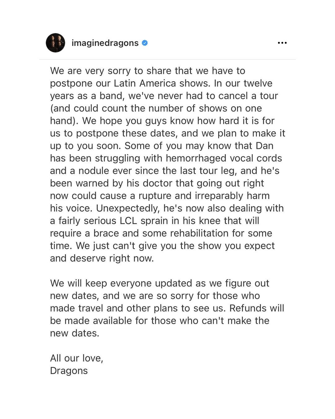 "Les comunicaremos muy pronto las nuevas fechas y lamentamos mucho por aquellas personas que planearon un viaje para vernos. El reembolso estará a disposición para aquellos que no puedan asistir a la nueva fecha. Con amor. Dragons", concluye.