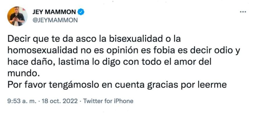 Ante las repercusiones que generaron sus declaraciones, Jey Mammón decidió dejar su opinión en las redes sociales. El conductor de La Peña de Morfi (Telefe) repudió los dichos que Martina: "Decir que te da asco la bisexualidad o la homosexualidad no es opinión, es fobia".