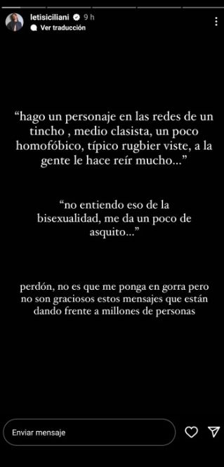 Otra famosa que se sumó a las críticas fue Leticia Siciliani. "Perdón, no es que me ponga en gorra, pero no son graciosos estos mensajes que están dando frente a millones de personas", comentó la actriz.