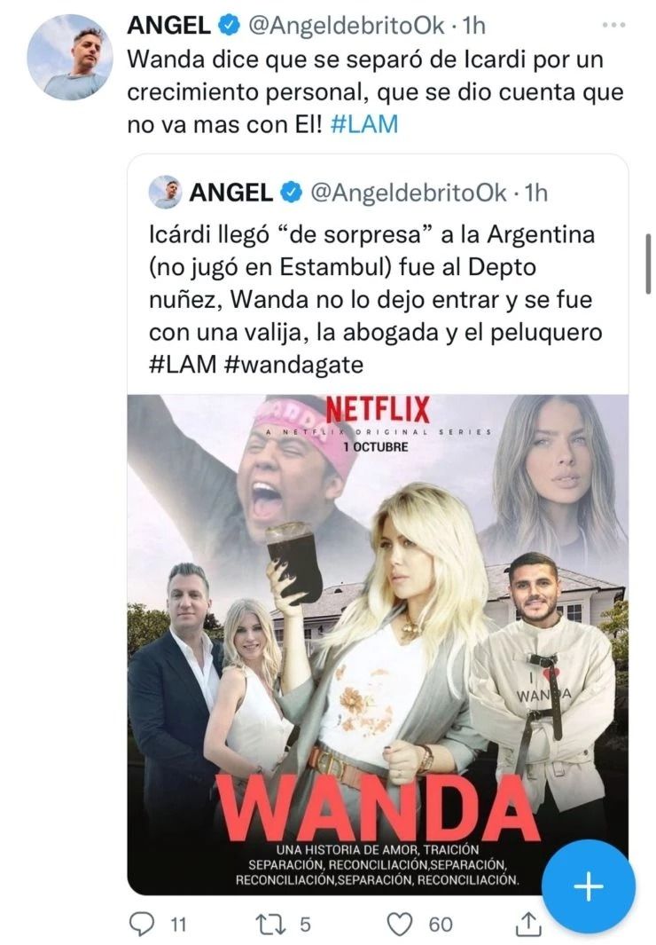 "Wanda dice que se separó de Icardi por un crecimiento personal, que se dio cuenta que no va mas con él. La abogada que es la intermediaria para negociar el divorcio, los escucha y siente que los dos tienen razón. La story de Wanda termino volviéndose realidad 'zorr... te cargaste a una familia'", finalizó.