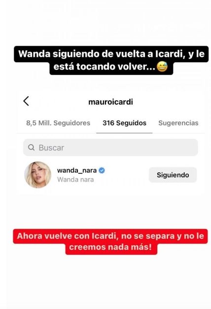 Sí, esa cuestión ya invita a pensar que Nara arrancó los motores para subsanar el vínculo amoroso. “Wanda siguiendo de vuelta a Icardi y le está tocando volver”, escribió este perfil que se dedica a la información sobre la vida de los famosos. Y añadió: “Ahora vuelve con Icardi, no se separa y no le creemos nada más”.