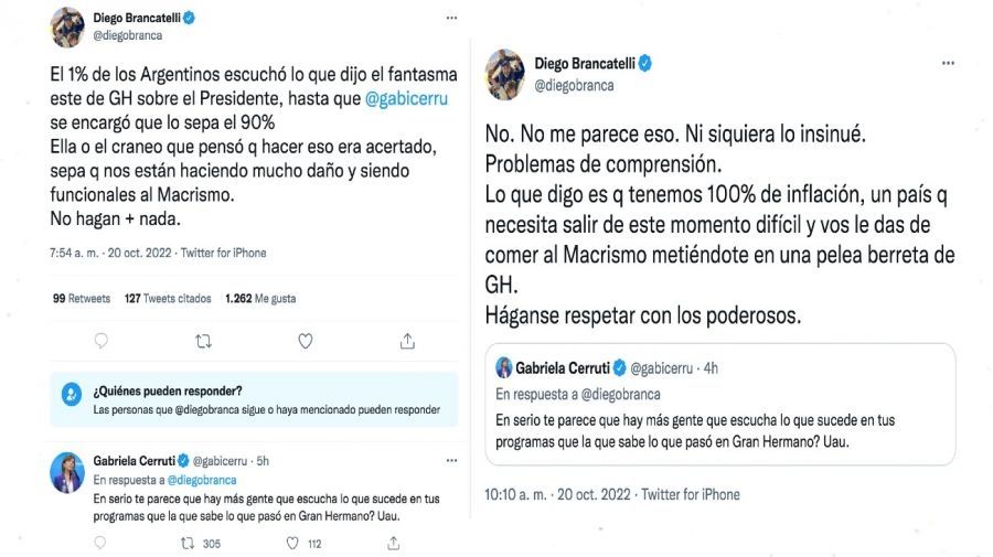 Entonces Brancatelli retrucó: "No. No me parece eso. Ni siquiera lo insinué. Problemas de comprensión. Lo que digo es que tenemos 100% de inflación, un país que necesita salir de este momento difícil y vos le das de comer al macrismo metiéndote en una pelea berreta de GH. Háganse respetar con los poderosos".