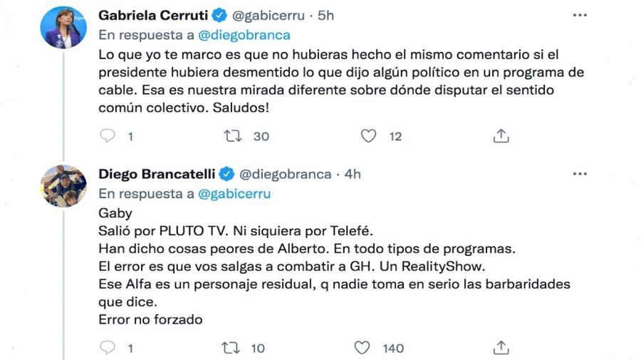 A través de las redes sociales, se dio un inesperado cruce entre el periodista defensor del oficialismo Diego Brancatelli y la portavoz presidencial Gabriela Cerruti. El comunicador tildó de "berreta" la pelea con Gran Hermano y la vocera de Alberto Fernández no se quedó callada.