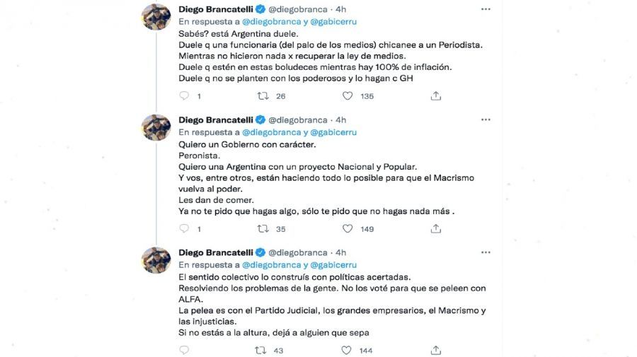 Finalmente, más allá de objetar el cruce con Gran Hermano, Brancatelli criticó la gestión de Fernández: "Quiero un Gobierno con carácter. Peronista. Quiero una Argentina con un proyecto Nacional y Popular. Y vos, entre otros, están haciendo todo lo posible para que el macrismo vuelva al poder. Les dan de comer. Ya no te pido que hagas algo, sólo te pido que no hagas nada más. El sentido colectivo lo construís con políticas acertadas. Resolviendo los problemas de la gente. No los voté para que se peleen con Alfa. La pelea es con el Partido Judicial, los grandes empresarios, el macrismo y las injusticias. Si no estás a la altura, dejá a alguien que sepa".