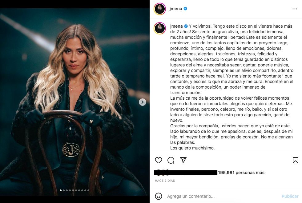 "¡Y volvimos! ¡Tengo este disco en el vientre hace más de 2 años! Se siente un gran alivio, una felicidad inmensa, mucha emoción y finalmente libertad", escribió esta semana Jimena Barón en su cuenta de Instagram tras lanzar La araña, su nueva canción.