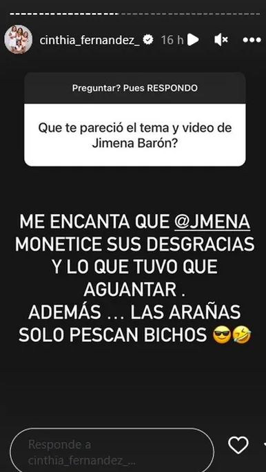 Lo cierto es que en este marco del revuelo que generó la letra de la nueva canción, a Cinthia Fernández le preguntaron su opinión sobre la canción vía Instagram y ella fue categórica: "Me encanta que Jimena monetice sus desgracias y lo que tuvo que aguantar. Además, las arañas solo pescan bichos".