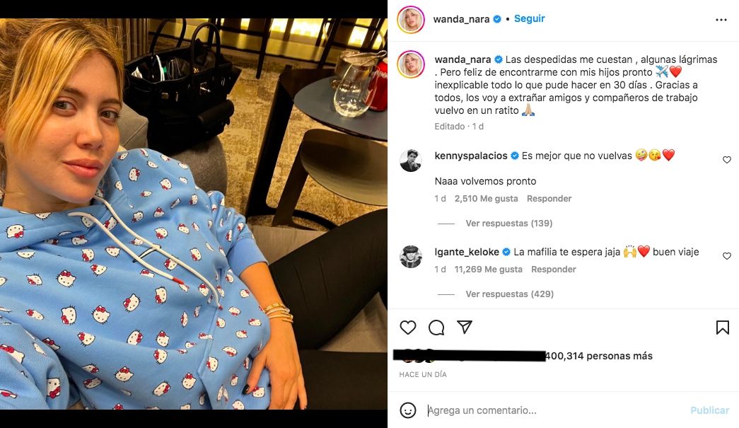 Además, se despidió de todos sus compañeros con los que trabajó intensamente durante los últimos 30 días en la Argentina, asegurando que volverá pronto. "Las despedidas me cuestan , algunas lágrimas . Pero feliz de encontrarme con mis hijos pronto inexplicable todo lo que pude hacer en 30 días . Gracias a todos, los voy a extrañar amigos y compañeros de trabajo vuelvo en un ratito", expresó Wanda.
