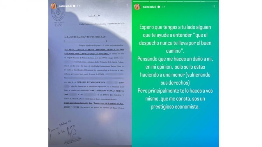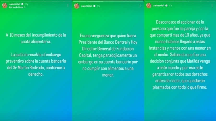 Tras darse a conocer la restricción que le impusieron a Martín Redrado, Luciana Salazar expresó desde sus historias de Instagram: "A 10 meses del incumplimiento de la cuota alimentaria, la Justicia resolvió el embargo preventivo sobre la cuenta bancaria del Sr. Martín Redrado, conforme a derecho. Es una vergüenza que quien fuera Presidente del Banco Central y hoy Director General de Fundación Capital, tenga paradójicamente un embargo en su cuenta bancaria por no cumplir con alimentos a una menor".