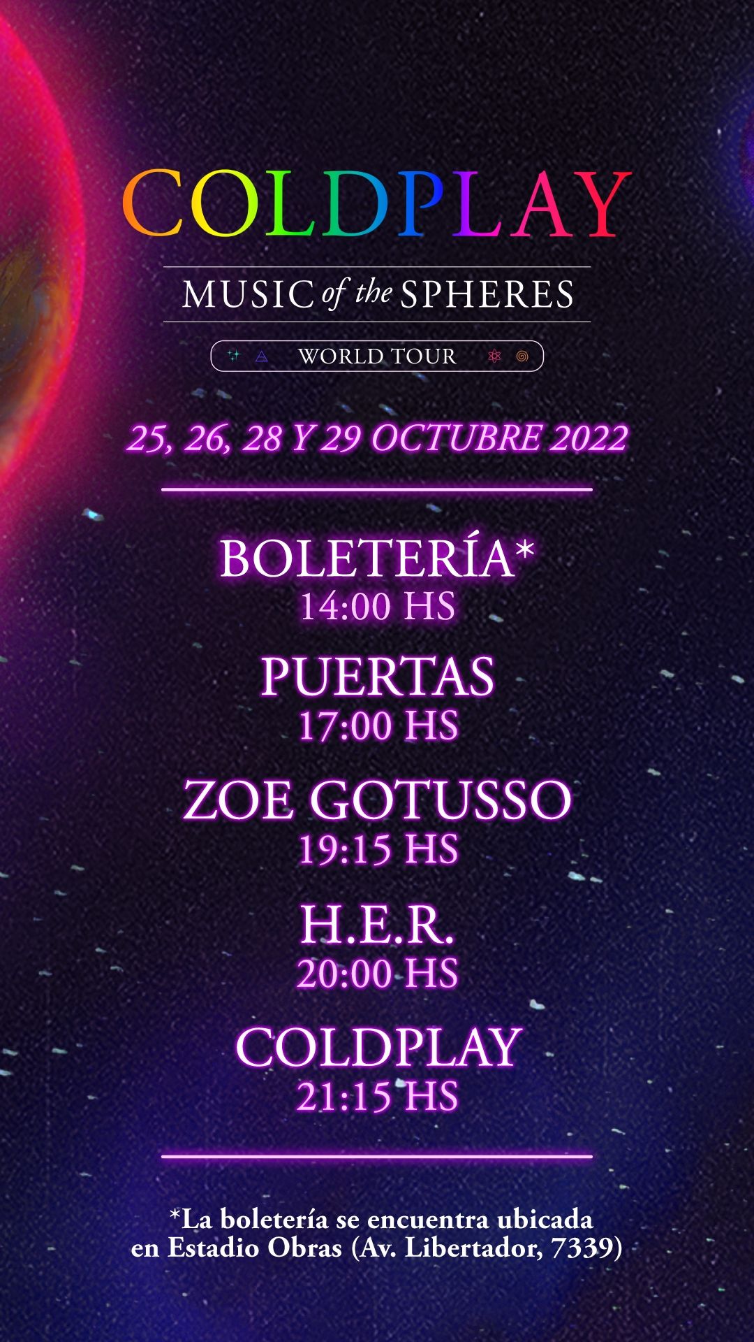 Este martes las puertas del estadio se abrirán a las 17:00. Siempre es conveniente ir con tiempo porque el ingreso puede llevar más tiempo de lo previsto. Para los que lleguen temprano, a las 19:15 será la presentación de Zoe Gotusso, La cantante cordobesa hará la apertura de esta previa con un show de alrededor de media hora. Luego, a las 20:00, será el turno de H.E.R. A las 21:15 finalmente se podrá ver a Coldplay sobre el escenario.