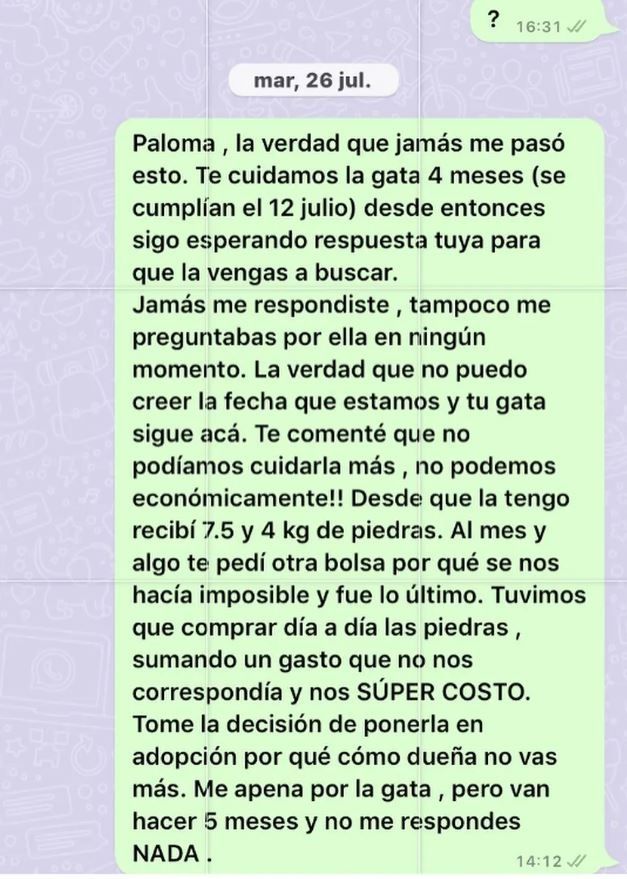 Como la joven dejó de responder a sus mensajes, debieron ponerla nuevamente en adopción. Para sustentar esta gravísima denuncia, en la cuenta oficial de Patitas a salvo compartieron una captura de chat de WhatsApp que da cuenta de la actitud indiferente de la modelo, que también le dejó su perro galgo a su mamá al irse de viaje.