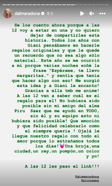 "Se los cuento ahora porque a las 12 voy a estar en una y no quiero dejar de compartirles esta historia", comenzó diciendo Dalma en una historia de Instagram.