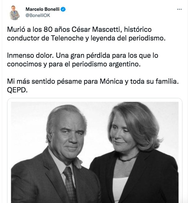 Por su parte, Marcelo Bonelli compartió su dolor desde su cuenta de Twitter: "Murió a los 80 años César Mascetti, histórico conductor de Telenoche y leyenda del periodismo. Inmenso dolor. Una gran pérdida para los que lo conocimos y para el periodismo argentino. Mi más sentido pésame para Mónica y toda su familia. QEPD".