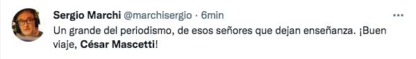 "Un grande del periodismo, de esos señores que dejan enseñanza. ¡Buen viaje, César Mascetti!", expresó el periodista y escritor Sergio Marchi.