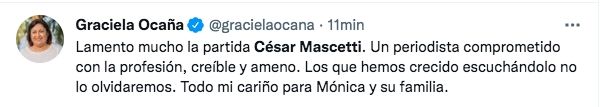 "Lamento mucho la partida César Mascetti. Un periodista comprometido con la profesión, creíble y ameno. Los que hemos crecido escuchándolo no lo olvidaremos. Todo mi cariño para Mónica y su familia", escribió en su cuenta de Twitter Graciela Ocaña, Diputada Nacional.
