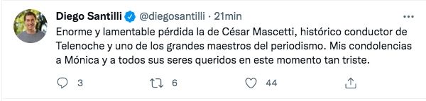 "Enorme y lamentable pérdida la de César Mascetti, histórico conductor de Telenoche y uno de los grandes maestros del periodismo. Mis condolencias a Mónica y a todos sus seres queridos en este momento tan triste", compartió Diego Santilli, Diputado Nacional por la Provincia de Buenos Aires.