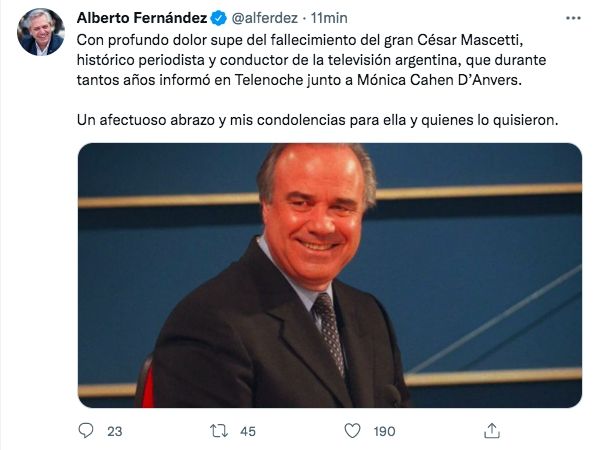 "Con profundo dolor supe del fallecimiento del gran César Mascetti, histórico periodista y conductor de la televisión argentina, que durante tantos años informó en Telenoche junto a Mónica Cahen D’Anvers. Un afectuoso abrazo y mis condolencias para ella y quienes lo quisieron", expresó el Presidente de la Nación, Alberto Fernández.