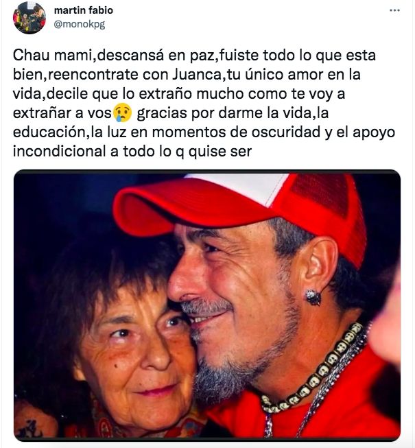 "Chau mami, descansá en paz, fuiste todo lo que está bien", comenzó expresando el cantante. "Reencontrate con Juanca, tu único amor en la vida, decile que lo extraño mucho como te voy a extrañar a vos", agregó en referencia a su marido y padre del artista.