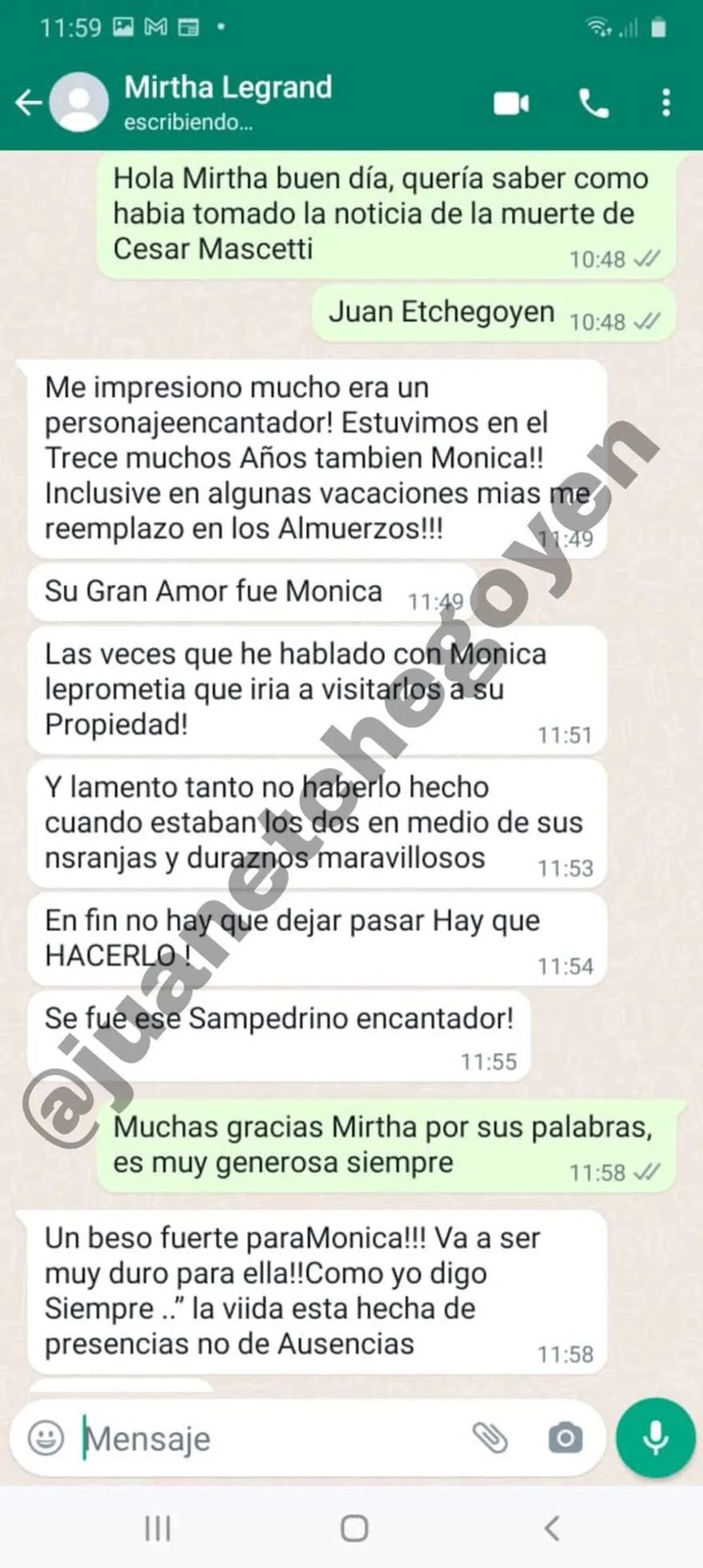 En el chat que el mencionado comunicador compartió, Mirtha Legrand aseguró también: “Su gran amor fue Mónica”. Además, la legendaria conductora remarcó que lamenta no haber cumplido su promesa de ir a visitar a la pareja a San Pedro-